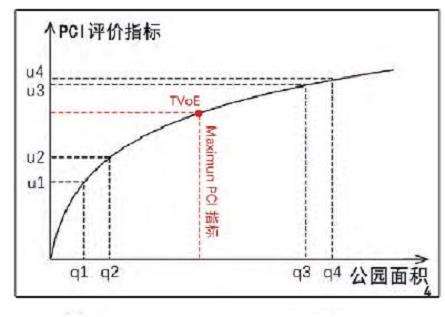 通过采用SPSS Statistics22对研究区域内公园面积与PCI效应评价指标进行回归分析,并采用余兆武[29-30]等提出的效率阈值Threshold Value of Effeciency(TVo E)理论构架来确定降温收益最大化下最小的公园面积。当公园面积与PCI效应评价指标的最优拟合曲线符合对数函数时,可以通过计算对数函数的导函数求得对数函数从快速增长到平缓增长的拐点值(TVo E值),在该导函数中,当y'=1(?降温效益/?公园面积=1)时的 x值即为最佳降温效果下的最小公园面积(图3)。