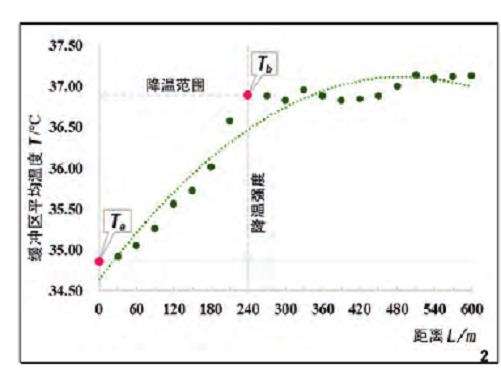 城市“公园冷岛(PCI)效应”指公园绿地和城市森林的植被通过蒸腾作用直接消耗了城市中的太阳辐射,同时阻碍了太阳辐射、路面和墙体热反射,在城市中形成“冷源”,从而改善城市微气候的现象[26]。通常用公园的“降温效应”即降温强度、降温范围、降温效率等指标来衡量公园的冷岛效应。