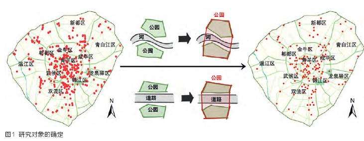 以及郫都区、新都区、温江区、双流区、龙泉驿区和青白江区。由于成都市五环内东南侧分布有大面积的龙泉山脉,不属于城市建成区域,因此本文将这一区域在研究范围内剔除。据统计,研究区域面积为2 876.34km2,包含约340个公园,以小面积的公园为主。