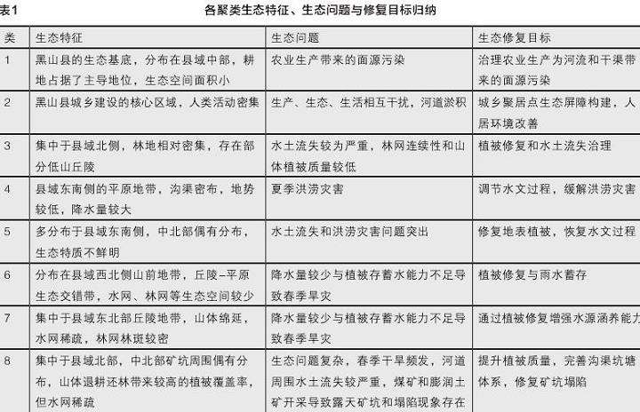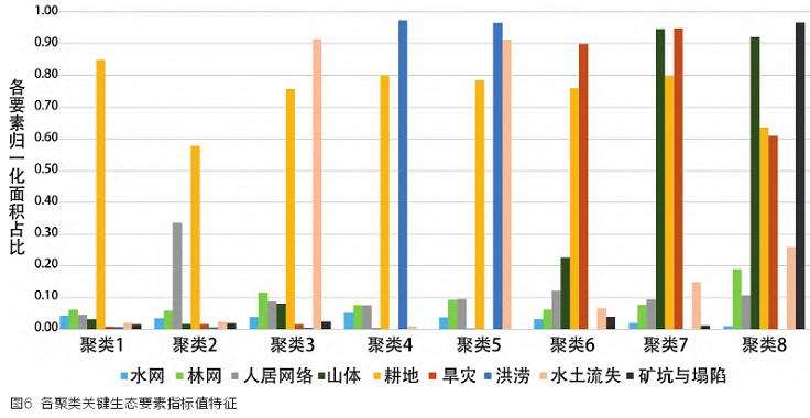 经过关键生态要素识别和聚类,黑山县县域被划分为8类生态特征和生态问题鲜明的聚类。图5、6分别展示各聚类的空间分布和生态要素指标值特征。结合实地调研,总结各聚类的生态特征、生态问题和生态修复目标(表1)。