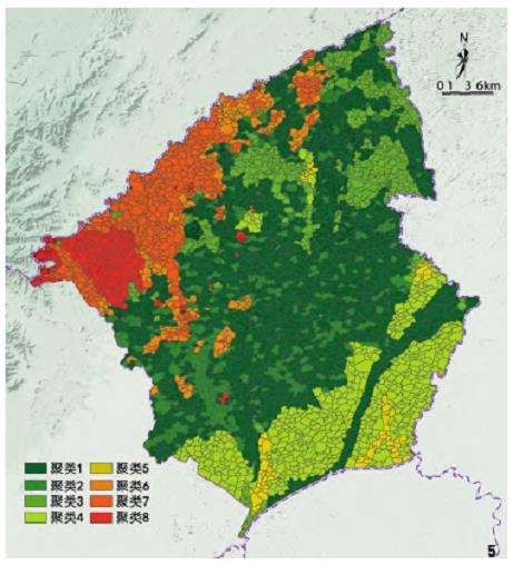 K-Medoids是聚类中最常见的算法,采用欧氏距离作为相似性判断的准则,该算法取样本中最靠近中心的对象,对异常值较不敏感[22],是其最常用的实现方式。假设将包含N个i维度研究单元的数据集划分为K类,各聚类中心点为Ok。首先,在所有样本中随机选择Ok,逐一计算剩余点M到Ok的欧氏距离,将M分配给距离最近的Ok所在类,得到初始聚类。然后,随机选M来替代Ok,记为OM,计算替代前后剩余点到中心点距离变化情况,判断OM是否优于Ok,迭代上述步骤至收敛[22-23]。本研究中上述步骤在R中实现,数据集含3969个样本,被9个维度所描述。聚类前采用最小均方误差法初判类别数。经多次试验,当K值为8时各聚类特征清晰,冗余信息少,因此将样本分为8组具有不同生态特征和问题的聚类。