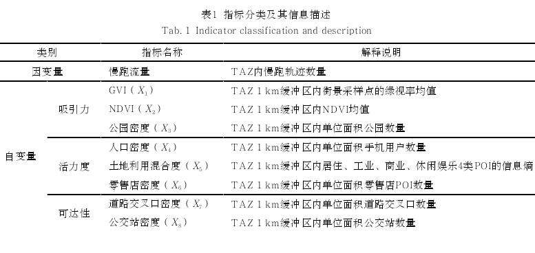 参照已有研究[5],利用 Arc GIS 空间关联和统计工具分时段计算每个 TAZ 内的慢跑流量,并作为因变量。参考国内外文献[5-10],建成环境因子(自变量)分别从吸引力、活力度、可达性 3 个维度进行选取(表 1)。
