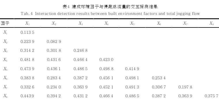 建成环境因子两两交互后对总体慢跑流量的解释力均大于单因子(表 4),这表明慢跑流量的空间分布差异是多建成环境因子共同作用的结果[26]。其中,人口密度和土地利用混合度二者交互对慢跑流量的解释力度最高 (X4∩X5,q 值为 0.498 8),即在 50% 程度上解释了慢跑流量的空间分异现象。人口密度、土地利用混合度与其他自变量交互后,对慢跑流量分异的影响产生了非线性增强和双因子增强效应,解释力都在 40% 以上。这表明人口密度和土地利用多样性对城市居民户外健身慢跑具有重要影响。