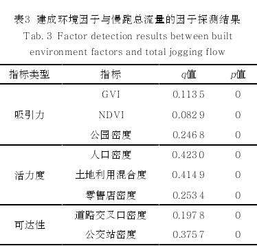 1)主导因子分析。不同时间段下的因子探测结果(表 5)表明:8 个建成环境因子在所有模型中都具有显著影响。人口密度、土地利用混合度、公交站点密度的 q 值在各个模型中都较高,说明 3 个因子对居民户外慢跑影响产生稳定的显著影响。此外,GVI 的解释力均高于 NDVI,表明视觉绿色对于慢跑更具影响力,这与已有研究结论一致[5, 33],其原因在于,慢跑用户多注重环境质量,期望通过环境视觉感知来提升幸福感和愉悦感[5]。