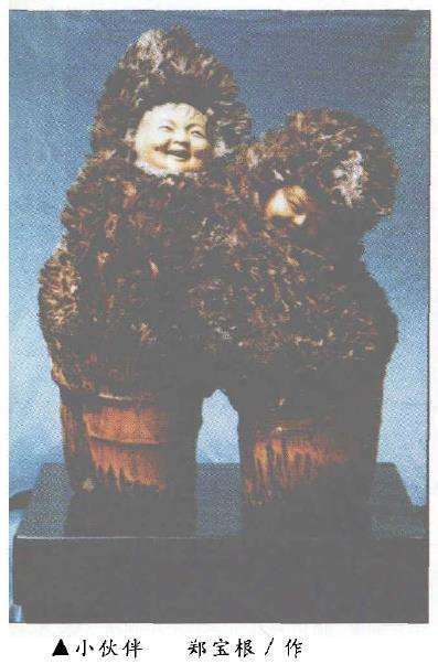 这是两个连在一起的粗犷竹根,根上的须毛紧密而自然。郑宝根经过反复地观察、揣摩,把这个连体竹根倒过来,运用须毛朝上的走势,构思了两个儿童的形象。他因材施艺,依势造型,保留了竹根上密密的须毛,使其自然地形成儿童身上毛茸茸的厚厚棉衣和兽皮帽;将毛竹根部的竹节处理成作品的底座,而把全部雕功放在两个比童的脸部刻画士,使细腻光洁的脸部和粗犷的棉衣、帽子形成了鲜明的粗细对比。