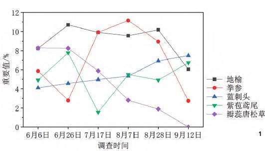蓝刺头的重要值随时间推移逐渐增大,表明蓝刺头在群落中的优势度随时间变化逐渐增高。