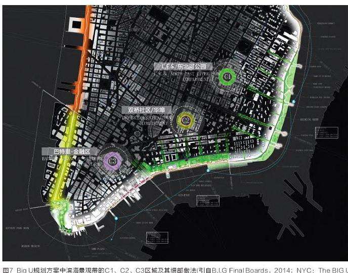 特点一,分区域规划布局与整体性运作。Big U的规划设计在结构上建立起整体与局部的动态关联性,在环曼哈顿下城沿海一带的连续堤岸上建设线型的缓冲区和隔离带。设计将节点、通道、面域结合起来形成层级明确的网络结构,以便于灾时抵御多变的冲击,减缓洪泛区的进一步扩大。如图7所示,Big U的规划设计通过3个区域(C1、C2、C3)的划分来整合离散的淹水地带。