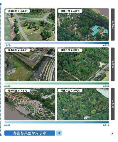从复杂度、郁闭度、天空率等三维指标来看。如图6-1所示,以自然要素占主导的5号鱼嘴片区内各空间单元的各项指标分异最为明显,而以人工要素占主导的4号青奥片区内各空间单元的各项指标分异差别较小。