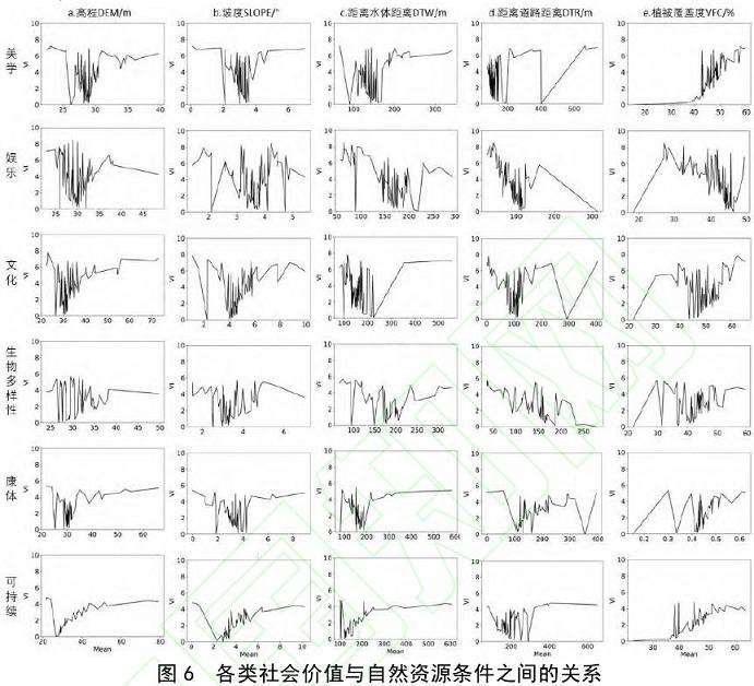 从距离道路距离(DTR)来看,DTR对娱乐和生物多样性价值的影响较大,价值指数随距离的增加而减小;与美学、文化、康体和可持续价值之间的关系并不明显(图6d)。