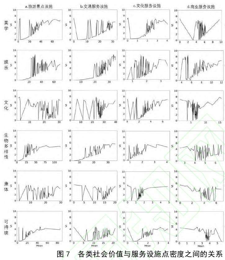 商业服务设施(SYFW)对娱乐、文化和可持续价值有较大影响,在其密度4-8之间时价值指数波动频繁。随着SYFW密度增加,娱乐和文化价值指数增加,可持续价值指数降低(图7d)。生活服务设施(SHFW)随着数量的增加,美学、娱乐、文化、生物多样性和可持续价值指数增加,其密度5-10之间时社会价值分布较集中(图7e)。