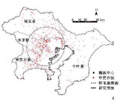标准差椭圆的中心位置(35°39′51.815″N,139°33′52.366″E)位于东京都调布市,标准差椭圆x轴和y轴的半径分别为32.63km和34.78km,且椭圆的旋转角度为31.03°,表明市民农园在空间上具有向南北方向扩散的趋势(图4)。