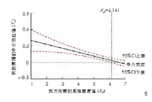 当积极情绪为中介变量时,地方依赖与积极情绪的乘积项显著负向影响幸福感(β=?0.181),表明地方依赖能够削弱积极情绪对老年人幸福感的影响,从而负向调节积极情绪的中介效应,且调节积极情绪中介效应的极大值为6.141(图5),假设H4b成立。