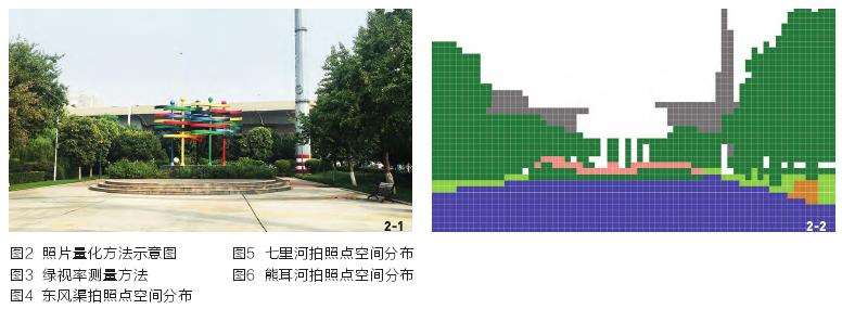绿视率的测量方法亦采用方格数量法,计算绿色植物所占格数与总格数的比值(图3)。对比分析不同等级样地物理及空间要素量化因子,初步探究志愿者偏好的植物景观空间特征。