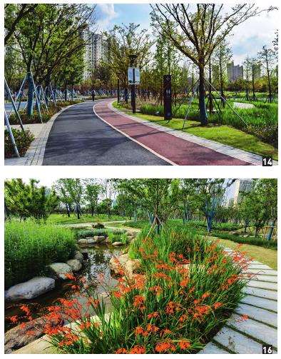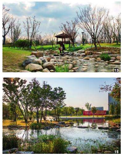 通过在山谷溪流两岸种植早樱形成“落花逐流水”的春季景观,成了每年春天的人气景点,樱花湾贯穿了整个绿色轴线,公园制高点处的山顶平台成为其最佳观景点;乌桕岛是主入口的对景(图15),种植在半岛上的乌桕凭借其自然野趣的树形,四季都散发着独特的魅力,秋季更成为公园中一抹独特的景观,形成“霜叶红于二月花”的秋日景象,或从水边眺望,或穿行其中,成为市民赏秋的好去处;流水花溪依托叠水溪涧打造(图16),叠水溪涧水深较浅,形成“清泉石上流”的意境,清泉蜿蜒的岸线、潺潺的流水结合丰富的植物,整体营造“疏影横斜水清浅”的诗意景观,一步一景,步移景异,成为整个公园最细腻精致的景观节点。