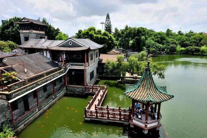 余荫山房坐落于广州番禺,1871 年建成,与卢廉若公园一样,最早为私家园林。如今看到的余荫山房是由新园区和旧园区两个部分组成,其旧园区是清朝举人邬彬卸所建,而新园区则是于 2006 年在魁星楼原址上还原重修而成,名为“文昌苑”。旧园区主要由善言邬公祠、庭园和瑜园组成,主要建筑除了祠堂本身外,还有来熏亭。庭院部分以浣江跨绿廊桥为轴形成东西区域,西边正门进入后为临池别馆及深柳堂,东边是孔雀亭及玲珑水榭。