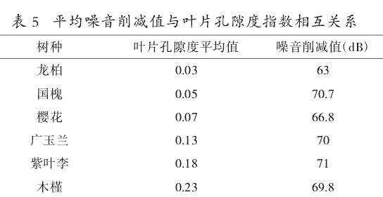 3.2.2孔隙度指数与削减噪音能力的分析。冠层孔隙度是指太阳光穿过树木冠层不被截获的几率,在冠层结构相同的条件下,叶片孔隙度会受阳光入射角度的影响,另外,不同的冠层结构叶片孔隙度也是不相同的[5]。通过提取试验树种叶片孔隙度指数数值,并与不同梯度内噪音削减值进行相关性分析,由表5可知,噪音削减值与叶片孔隙度指数双侧在0.05水平上显著呈现反向相关,也就说明叶片孔隙度指数越小对噪音的削减能力就越强。
