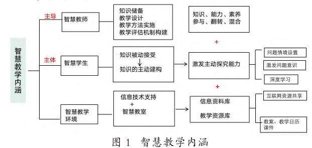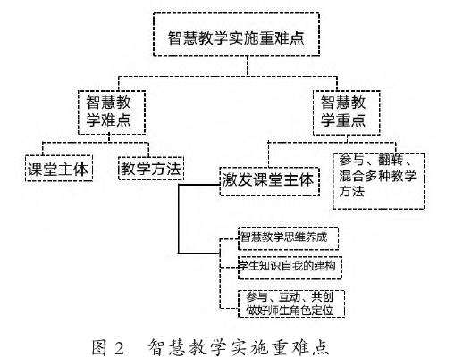 智慧教学倡导“教师主导、学生主体”教学理念,主张打造“师生共同体”,强调教师在传道授业之外,更加注重学生的行动参与,让其通过主动探索的提升获得能力与素养。智慧教学实施过程中,重难点在于如何激发课堂主体之一的学生主体积极性,通过翻转教学、小组教学、任务驱动等多种教学法混合应用,同时在评价环节中通过多元化评价体系的实施,让学生参与到自我评价、小组评价和组间评价,增加学习途径,融入线上教学平台,旨在多方融合促进学生的课堂参与度。智慧教学的重难点梳理(见图2)。