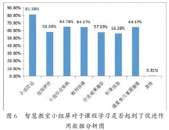 线下教学环境主要集中在智慧教室。智慧教室内硬件由小组圆桌、智慧屏幕和小组屏幕构成,在针对智慧教室教学环境“智慧教室小组屏对于课程学习是否起到了促进作用?”的问题中,89.88%的同学选择了智慧屏对于课程学习有促进作用。在“智慧教学环境对课堂教学活动哪个环节最有促进作用?”问题中,数据现实智慧教室的硬件智慧屏幕对小组讨论最有促进作用,有利于小组进行驱动式任务的完成(见图6)。