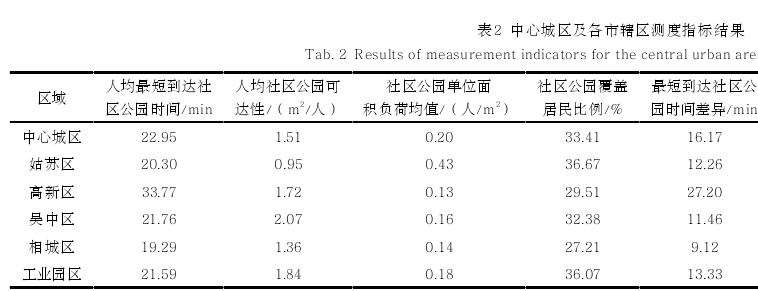 服务水平指标层的 3 项指标互为补充,初步反映社区公园服务水平和居民获取能力,结合可达便捷性的指标,可以发掘空间错配 1 苏州市中心城区公园布局及人口分布现状是否影响服务水平,综合表征中心城区、市辖区社区公园布局空间效率。