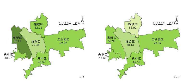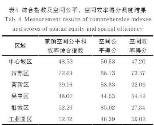 从市辖区层面看(表 4),兼顾空间公平和效率综合指数呈现姑苏区>工业园区>相城区>吴中区>高新区的结果。