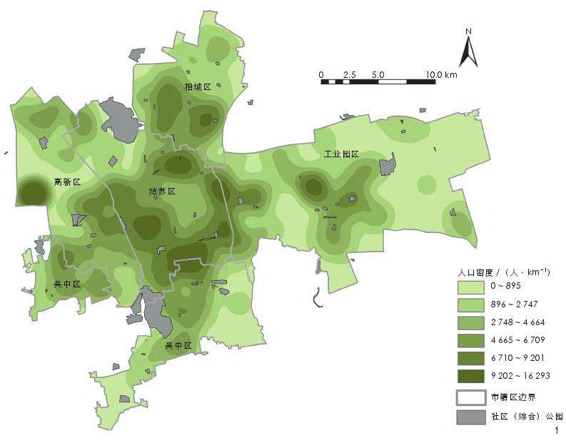 本研究选取苏州市中心城区作为研究区域,包括姑苏区全域以及吴中区、相城区、高新区和工业园区的部分街道,共涉及 5 个市辖区,总面积约为437 km2[30]。苏州市位于长三角东南部,拥有丰富的自然资源,城市绿化功能完善,作为全国首批生态园林城市,在公园绿地建设方面具有领先性,可为其他城市提供方法经验借鉴。中心城区是苏州市的核心发展区域,存在大量社区公园,但人口高度集聚,且土地利用状况紧张,不同市辖区间居民和社区公园分布差异较大,现有的社区公园难以满足居民需求。选择苏州市中心城区开展兼顾公平和效率的社区公园布局测度研究具有典型性和代表性。