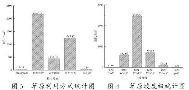根据草原承担的功能用途,云南省将草原利用方式分11种,漾濞县涉及5种。由图3、表3可知,利用方式为自然保护的面积最大,为2173.17hm2,占56.12%,分布在云南苍山洱海国家级自然保护区和云南漾濞绿漾省级森林公园内;打(割)草场面积0.18hm2,全部为苍山西镇的人工草地;其他利用方式面积1247.87hm2,占32.22%。从草原利用方式看,漾濞县的草原主要承担生态保护的功能,对农牧业相关的生产生活功能提供较少,未充分挖掘漾濞草原资源的优势。