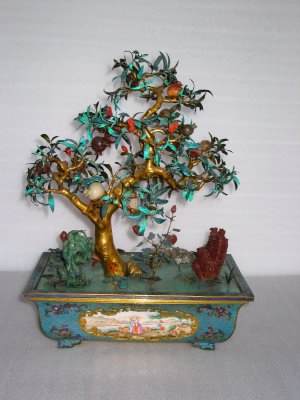 核心提示:盆景以石榴树为主景,树干为木质,涂以金漆,彰显富丽。树叶用铜片烧蓝而成,石榴果则用各色玛瑙精心雕琢,挂满枝头,暗含子孙满堂之意。树下配以桃树、灵芝、绣球花、山石、水草等,颇有情趣。