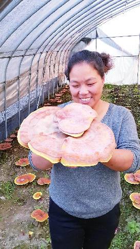 周光梨带着记者来到栽培灵芝的大棚,大棚里面只有两丘田,其中一丘上面生长着很多灵芝,大小不一,大的有脸盆那么大,有的边缘还是嫩黄白色的。而另一丘上面就只有稀稀拉拉的几个小灵芝。周光梨说,个子小的灵芝是用袋料栽培的,现在看来效果不大理想,好几袋袋料都没有长出灵芝来。长出大而漂亮的灵芝的都是用椴木栽培的。