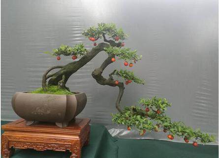 (图为“一枝红杏出墙来”的现场盆景展)