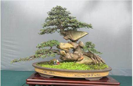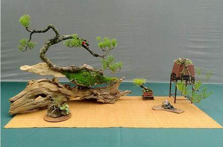 (图为木与石浑然一体的现场盆景展)