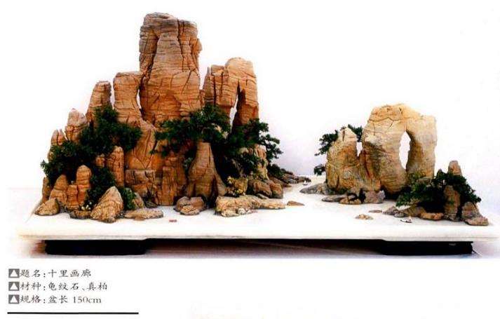作者在十几年前,游览张家界“十里画廊”,被其美景所震撼并迷恋其间,难以忘怀。一,G想做一盆表现张家界“十里画廊”的山水盆景,以慰藉这久久不能平息的心怀。于是从收藏30多年的石料库中,精心挑选出主峰、次峰、配峰、坡脚石、配石、点石和形、色、质、纹、韵相统一的石种。经过几年认真的构思推敲、组合布局,终完成此盆魂牵梦绕的佳作“十里画廊”。